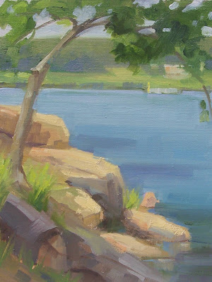 The second day of the workshop we drove an hour west to the Witchita mountains, how pretty, they were covered with yellow flowers. I could have painted here for a week. We arrived at a river with boulders and bright sun. Painting plein air is hard work, carrying all the equipment, you really have to scale back on what is absolutley nesessary. Ask me how I know. Ugh!